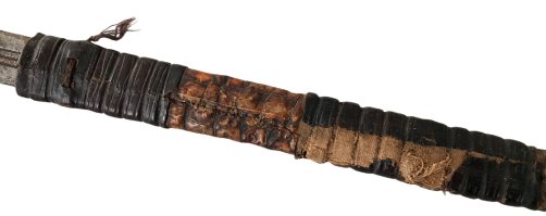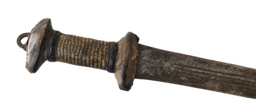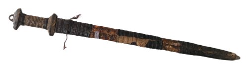 -Zweischneidige, beidseitig dreifach gekehlte Klinge mit typischem hölzernen, Textil- und lederbezogenem Gefäß