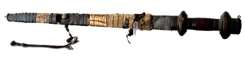 -Zweischneidige, beidseitig dreifach gekehlte Klinge mit typischem hölzernen, Textil- und lederbezogenen Gefäß